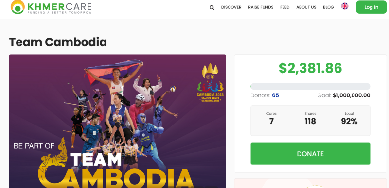 "นักกีฬาไม่สามารถบรรลุเป้าหมายได้โดยลำพัง พวกเขาต้องการกำลังใจจากครอบครัว เพื่อน และโดยเฉพาะชาวกัมพูชาที่อยู่ร่วมชาติเดียวกันเพื่อสนับสนุนพวกเขาให้ได้รับชัยชนะและประสบความสำเร็จเพื่อชาติของเรา คุณสามารถมอบอำนาจให้นักกีฬากัมพูชา ด้วยการบริจาคเงิน" ซึ่งตามรายงานเผยว่ากัมพูชาตั้งเป้าไว้ 1 ล้านเหรียญสหรัฐ หรือประมาณ 33 ล้านบาท