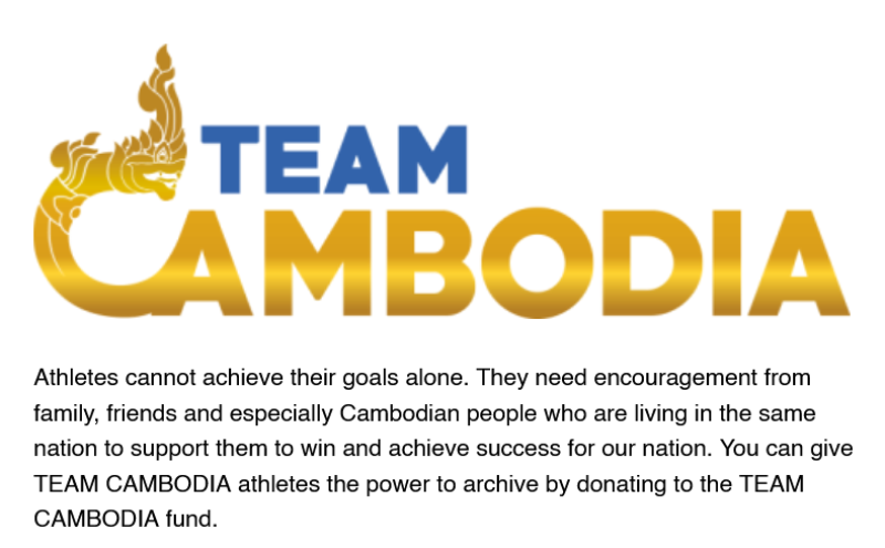 ร่วมเป็นส่วนหนึ่งของ Team Cambodia โดยมอบพลังให้กับฮีโร่ของอาณาจักรเพื่อบรรลุความยิ่งใหญ่โดยบริจาคเงินเข้า Team Cambodia Fund ด้วยเงินบริจาคเพียง $1 ไม่มีการบริจาคใดที่น้อยเกินไปที่จะสร้างผลกระทบเชิงบวกต่อสังคม การสนับสนุนไม่ว่าจำนวนเท่าใดก็ตามจะช่วยสนับสนุนนักกีฬาทีมกัมพูชาในการนำความรุ่งโรจน์มาสู่ราชอาณาจักร เช่น การอัพเกรดอุปกรณ์การฝึกซ้อม รองเท้า เสื้อผ้า และการสนับสนุนด้านวิทยาศาสตร์การกีฬาและเวชศาสตร์การกีฬา