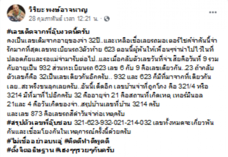 โดยในเฟซบุ๊ก วิริยะ พงษ์อาจหาญ โพสต์ข้อความระบุว่า