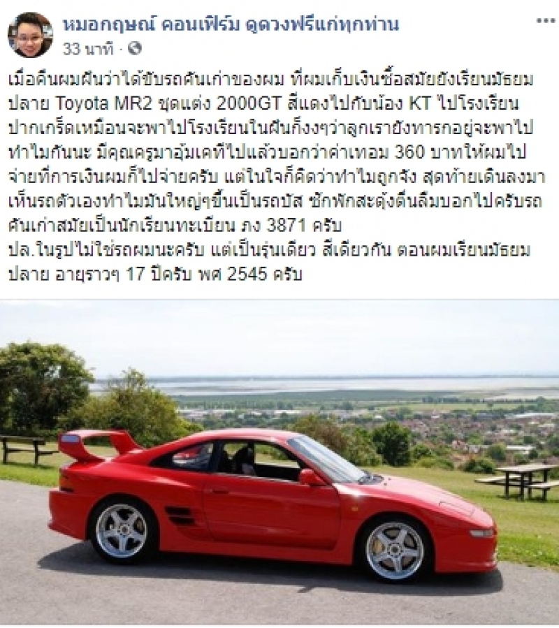 ล่าสุดวันนี้ หมอกฤษณ์ คอนเฟิร์ม ได้มีการโพสต์รูปภาพพร้อมทั้งระบุข้อความว่า เมื่อคืนผมฝันว่าได้ขับรถคันเก่าของผม ที่ผมเก็บเงินซื้อสมัยยังเรียนมัธยมปลาย Toyota MR2 ชุดแต่ง 2000GT สีแดงไปกับน้อง KT ไปโรงเรียนปากเกร็ดเหมือนจะพาไปโรงเรียนในฝันก็งงๆว่าบุตรเรายังเล็กอยู่จะพาไปทำไมกันนะ มีคุณครูมาอุ้มเคทีไปแล้วบอกว่าค่าเทอม 360 บาทให้ผมไปจ่ายที่การเงินผมก็ไปจ่ายครับ แต่ในใจก็คิดว่าทำไมถูกจัง สุดท้ายเดินลงมาเห็นรถตัวเองทำไมมันใหญ่ๆขึ้นเป็นรถบัส ซักพักสะดุ้งตื่นลืมบอกไปครับรถคันเก่าสมัยเป็นนักเรียนทะเบียน ภง 3871 ครับ