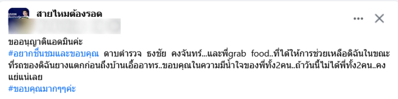 เรียกได้ว่าเป็นอีกหนึ่งเรื่องราวดีๆ ที่ได้รับเสียงชื่นชมเป็นอย่างมาก หลังจากที่ผู้ใช้เฟซบุ๊กรายหนึ่ง ได้มีการโพสต์ภาพความประทับใจ ของน้ำใจคนไทยด้วยกัน โดยได้โพสต์ในกลุ่ม สายไหมต้องรอด เล่าถึงเหตุการณ์นี้ว่า ขออนุญาติแอดมินค่ะ #อยากชื่นชมและขอบคุณ ดาบตำรวจ ธงชัย คงจันทร์...และพี่grab food..ที่ได้ให้การช่วยเหลือดิฉันในขณะที่รถของดิฉันยางแตกก่อนถึงบ้านเอื้ออาทร..ขอบคุณในความมีน้ำใจของพี่ทั้ง2คน..ถ้าวันนี้ไม่ได้พี่ทั้ง2คน..คงแย่แน่เลย #ขอบคุณมากๆๆค่ะ