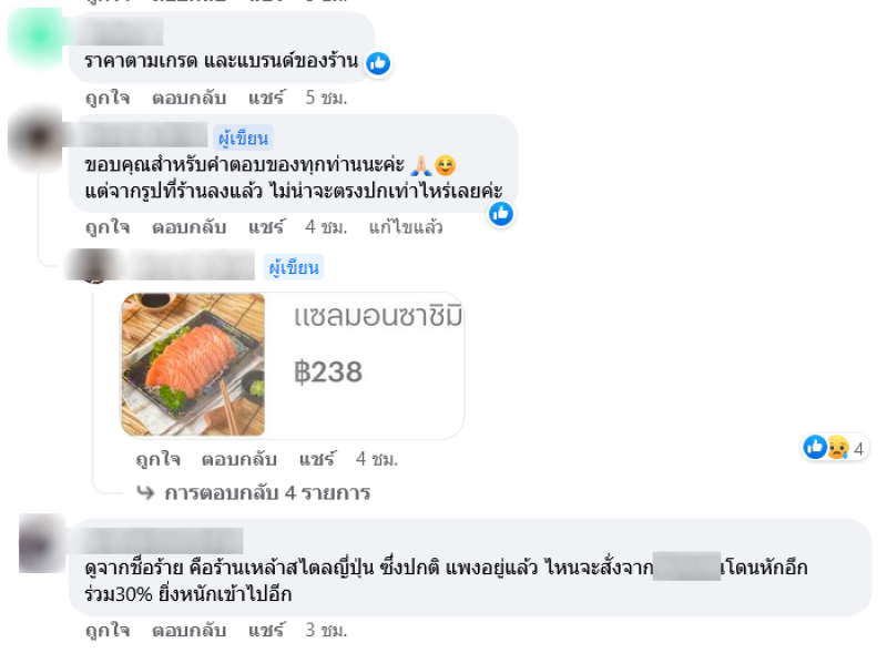 อย่างไรก็ตาม หลังจากที่ได้มีการโพสต์ถาม ก็มีชาวโซเชียลเข้ามาแสดงความคิดเฆ้น อาทิเช่น แพง ร้านดีๆพรีเมียมยัง3ชิ้น 99,รู้แค่ว่าเดี๋ยวนี้แซลมอลแพงขึ้น แต่เราไม่เคยกินนะ ข้างบ้านขายครึ่งโล 500 ค่ะ มาจากเ่จแปนแท้ๆ,ดูจากชื่อร้าย คือร้านเหล้าสไตลญี่ปุ่น ซึ่งปกติ แพงอยู่แล้ว ไหนจะสั่งจาก...โดนหักอีกร่วม30% ยิ่งหนักเข้าไปอีก