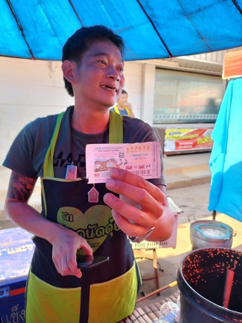 ทั้งนี้ เจ้าตัวเผยว่า เลขดังกล่าว เห็นว่าเป็นปี พ.ศ.ที่คบกับแฟนสาว ในปี 2552 จึงซื้อเก็บไว้ 1 ใบ หลังจากที่ถูกรางวัล ก็เลิกขายของแล้วแจกให้แก่ประชาชนที่ถนนคนเดิน เทศบาลตำบลเสิงสางทันที