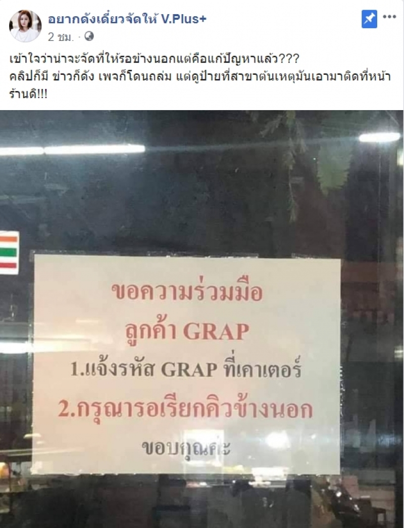 จากกรณีที่มีคลิปเผยแพร่ออกไปเป็นจำนวนมาก หลังพนักงานส่งอาหาร แกร็บฟู้ด ได้เข้าไปสั่งเครื่องดื่มให้กับลูกค้า แต่โดนทางร้านไล่ให้ออกไปรอข้างนอก และไม่ยอมทำเครื่องดื่มให้ตามที่ลูกค้าสั่งมา ล่าสุดเพจเฟซบุ๊ก อยากดังเดี๋ยวจัดให้ V.Plus+ ได้โพสต์ภาพป้ายติดประกาศของร้านกาแฟสาขาต้นเหตุ ซึ่งมีข้อความระบุว่า