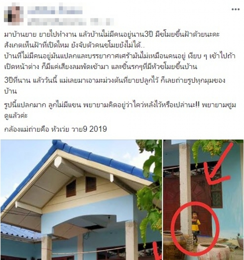 เรียกได้ว่าเป็นเรื่องราวที่มีคนแห่เข้ามาแสดงความคิดเห็นกันเป็นจำนวนมาก ล่าสุดผู้ใช้เฟซบุ๊กท่านหนึ่ง ที่ได้ออกมาเผยภาพถ่าย ที่เธอได้ถ่ายภาพบุตรสาวของเธอ ในขณะที่อยู่ในบ้านคุณป้าของเธอ ซึ่งบ้านหลังนี้บรรยากาศเงียบวังเวงเพราะไม่มีคนอาศัยอยู่นาน แต่ที่เธอรู้สึกผิดปกติคือ ในภาพ บุตรของเธอไม่มีแขน