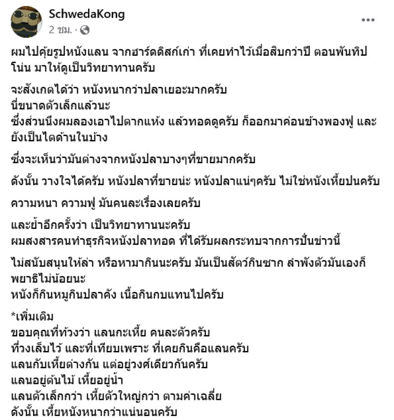 ล่าสุดผู้ใช้เฟซบุ๊กชื่อ SchwedaKong พ่อครัวหรือที่รู้จักกันในชื่อเชฟบังก้อง ได้นำภาพตัวอย่างมาให้ดูกัน โดยเป็นภาพหนังทอดกรอบ จากตัวเงินตัวทองของจริง ซึ่งจะมีลักษณะแตกต่างจากหนังปลาทอดกรอบ