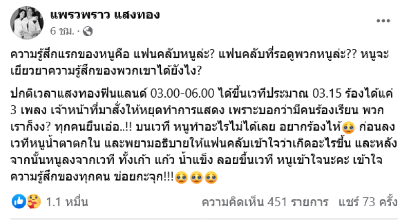 ปกติเวลาแสงทองฟินแลนด์ 03.00-06.00 ได้ขึ้นเวทีประมาณ 03.15 ร้องได้แค่ 3 เพลง เจ้าหน้าที่มาสั่งให้หยุดทำการแสดง เพราะบอกว่ามีคนร้องเรียน พวกเราก็งง? ทุกคนยืนเอ๋อ..!! บนเวที หนูทำอะไรไม่ได้เลย อยากร้องไห้ ก่อนลงเวทีหนูน้ำตาตกใน และพยามอธิบายให้แฟนคลับเข้าใจว่าเกิดอะไรขึ้น และหลังจากนั้นหนูลงจากเวที ทั้งเก้า แก้ว น้ำแข็ง ลอยขึ้นเวที หนูเข้าใจนะคะ เข้าใจความรู้สึกของทุกคน ข่อยกะจุก"