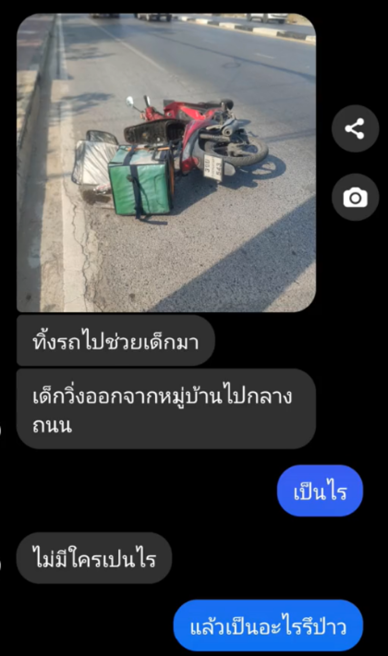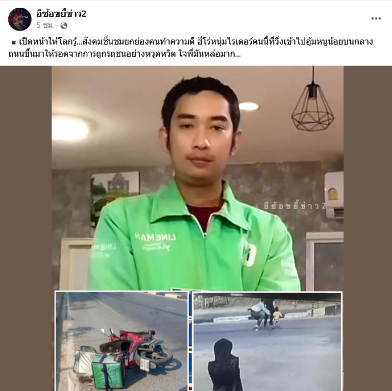 จากกรณีที่ผู้ใช้บัญชี tiktok ชื่อ ch_chamaiporn ได้เผยคลิปวินาทีที่ไรเดอร์หนุ่ม ตัดสินใจเพียงเสี้ยววินาที ทิ้งรถ จยย. วิ่งเข้าช่วยเหลือเด็กที่วิ่งข้ามถนน ซึ่งมีรถยนต์สัญจรไปมา โดยสามารถคว้าตัวเด็กไว้ได้ปลอดภัยทั้งคู่ (ชมคลิปคลิกที่นี่) เจ้าตัวเผยว่าวินาทีนั้นตัดสินใจตามสัญชาตญาณ เพื่อช่วยให้เด็กปลอดภัยไว้ก่อน โดยหลังจากที่ได้มีการโพสต์คลิป ก็ได้รับเสียงชื่นชมเป็นอย่างมาก