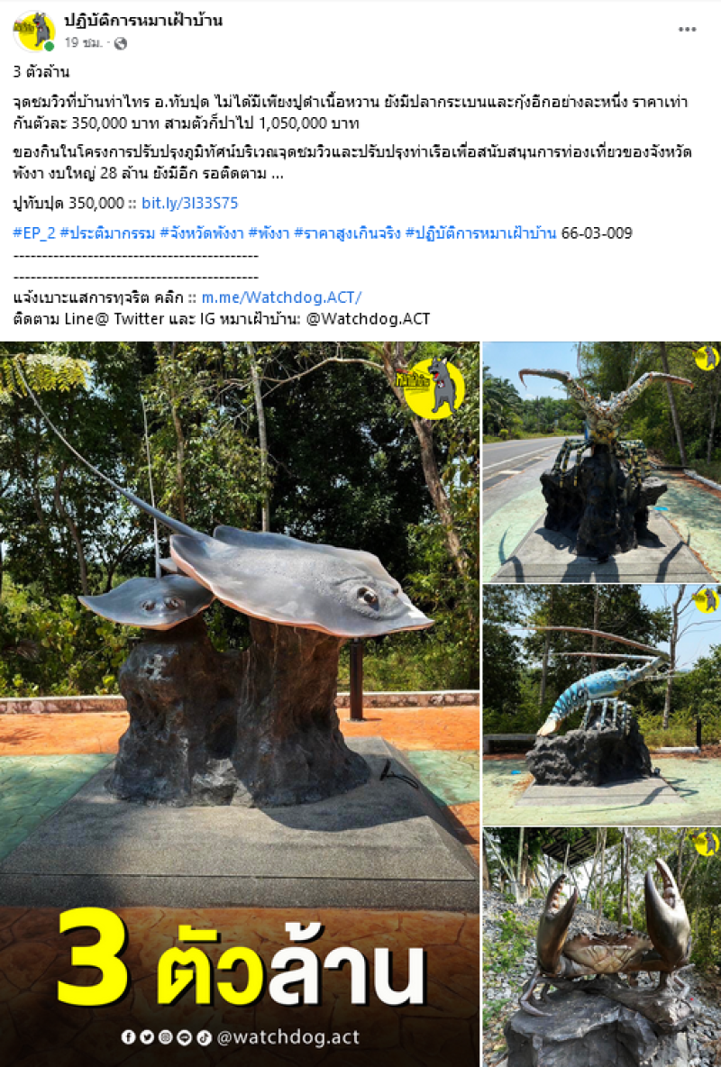 เรียกได้ว่าเป็นอีกหนึ่งเรื่องราวที่เรียกเสียงวิพากษ์วิจารณ์ จากประชาชนเป็นอย่างมาก หลังจากที่ทางเฟซบุ๊กเพจ ปฏิบัติการหมาเฝ้าบ้าน ได้มีการลงภาพรูปปั้นสัตว์ทะเลที่จังหวัดพังงา โดยระบุว่า 3 ตัวล้าน จุดชมวิวที่บ้านท่าไทร อ.ทับปุด ไม่ได้มีเพียงปูดำเนื้อหวาน ยังมีปลากระเบนและกุ้งอีกอย่างละหนึ่ง ราคาเท่ากันตัวละ 350,000 บาท สามตัวก็ปาไป 1,050,000 บาท ของกินในโครงการปรับปรุงภูมิทัศน์บริเวณจุดชมวิวและปรับปรุงท่าเรือเพื่อสนับสนุนการท่องเที่ยวของจังหวัดพังงา งบใหญ่ 28 ล้าน ยังมีอีก รอติดตาม