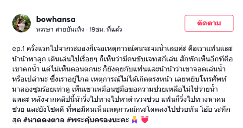 เรียกได้ว่าเป็นอีกหนึ่งเหตุการณ์ระทึกที่ถูกแชร์อย่างมากในโลกออนไลน์ หลังจากที่ผู้ใช้บัญชี TikTok ชื่อ bowhansa ได้โพสต์คลิปชายคนหนึ่งอยู่ในน้ำ โดยเป็นคนขับเจ็ตสกี ที่ไม่ได้ใส่เสื้อชูชีพ จนกระทั่งได้เกิดเหตุตกลงไปในน้ำทะเล ซึ่งในตอนแรกก็คิดว่าเป็นคนที่เล่นน้ำตามปกติ พอลองใช้มือถือถ่ายคลิป ด้วยพลังซูม 100 เท่า ถึงรู้ว่าชายคนดังกล่าวได้พยายามขอความช่วยเหลือ ไม่ใช่คนที่เล่นน้ำตามปกติ