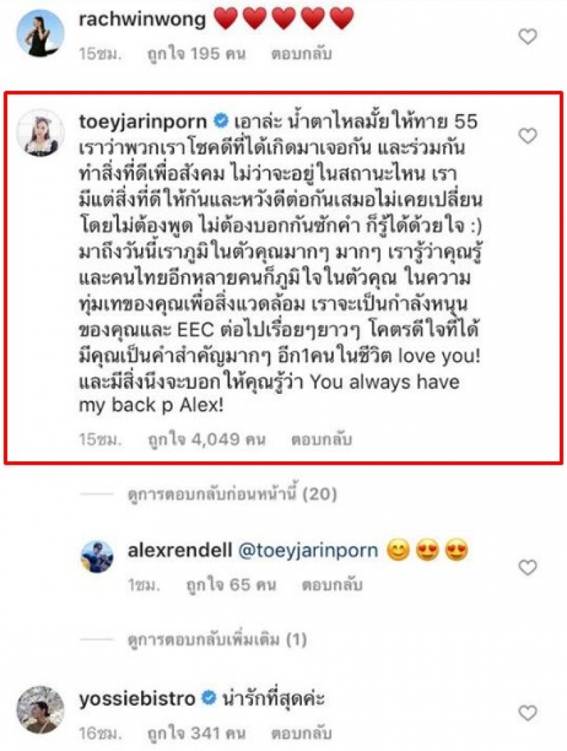ไม่เคยคิดไม่ดีต่อกันเเละกัน เคารพในชีวิตส่วนตัวของเเต่ละคน เเละมีเเต่หวังดี เราเชื่อว่าความจริงใจตรงนี้ไม่มีวันหมดอายุเเน่นอน u r the best p toey we will support each other for years to come กอดป่ากอดทะเล เม้นทางลบถูกลบ