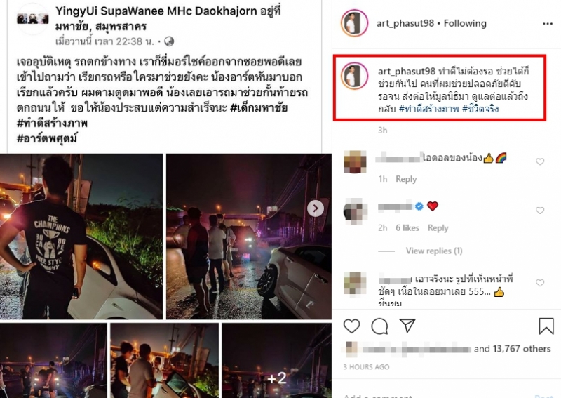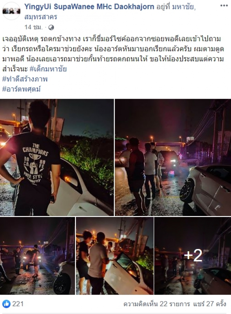 เรียกได้ว่าเป็นเรื่องราวที่มีคนแห่เข้ามาแสดงความคิดเห็นกันเป็นจำนวนมาก โดยได้มีการแชร์ภาพ ดาราหนุ่มชื่อดัง ได้ลงมาช่วยรถที่เกิดเหตุ เพราะรถตกข้างทาง โดยบังเอิญ พร้อมข้อความระบุว่า เจอเหตุ รถตกข้างทาง เราก็ขี่มอร์ไซค์ออกจากซอยพอดีเลยเข้าไปถามว่า เรียกรถหรือใครมาช่วยยังคะ น้องอาร์ตหันมาบอกเรียกแล้วครับ ผมตามมาพอดี น้องเลยเอารถมาช่วยกั้นท้ายรถตกถนนให้ ขอให้น้องประสบแต่ความสำเร็จนะ เด็กมหาชัย ทำดีสร้างภาพ อาร์ตพศุตม์
