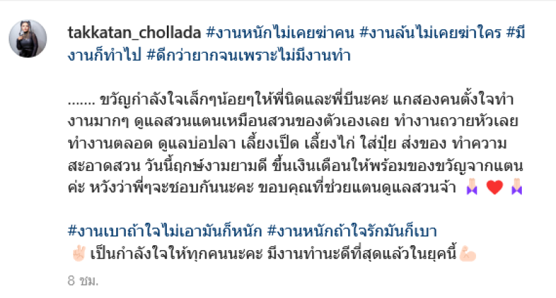 ล่าสุดในไอจีของเจ้าตัว ก็ได้โพสต์ภาพโมเมนต์สุดประทับใจ เมื่อสาวตั๊กแตนได้เรียกคนสวนที่บ้านมาหา ก่อนจะบอกข่าวดีว่าจะขึ้นเงินเดือนให้ จากเดือนละ 10,000 เป็นเดือนละ 15,000 พร้อมกับเปย์กระเป๋าหรูให้คนสวนอีกด้วย งานนี้ทำเอายิ้มไม่หยุด แฟนๆต่างชื่นชมในความมีน้ำใจของสาวตั๊กแตน