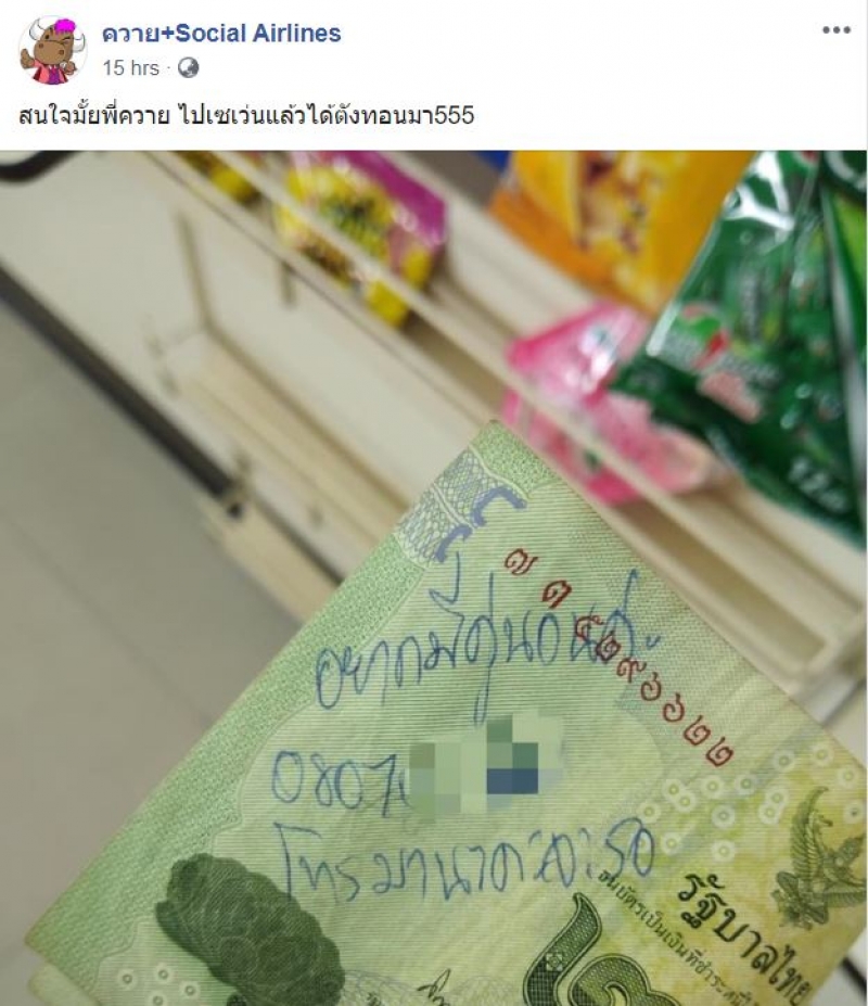 เรียกได้ว่าเป็นเรื่องราวที่มีคนแห่เข้ามาแสดงความคิดเห็นกันเป็นจำนวนมาก ขณะที่ผู้ใช้เฟสบุ๊ครายหนึ่ง เข้าไปซื้อของที่ร้านสะดวกซื้อตามปกติ ถึงช่วงต่อคิวจ่ายเงินที่เคาน์เตอร์ก็พบว่าเงินทอนที่พนักงานให้มานั้น ได้มีข้อความเขียนไว้อยู่ อ่านจบถึงขั้นขนลุก ยิ่งกว่าส covid-19 ที่อาจจะติดมากับธนบัตรเสียอีก