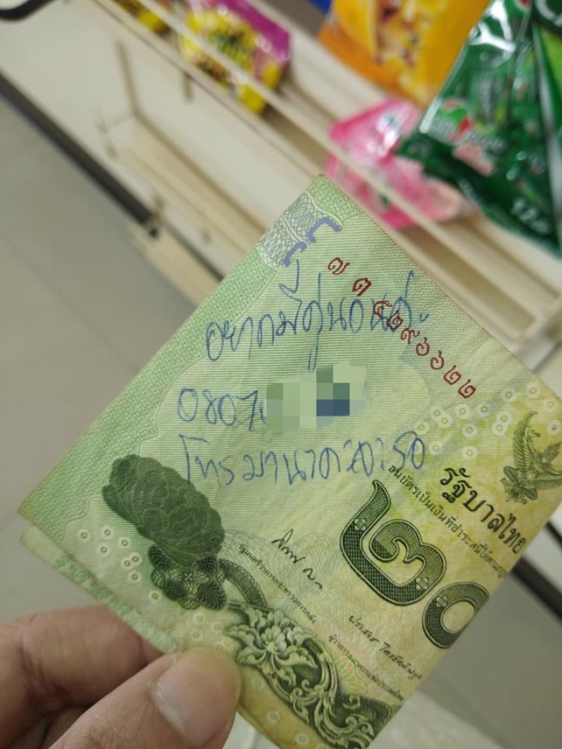 หนุ่มรายหนึ่งได้เข้าไปซื้อกินของใช้ภายในร้านสะดวกซื้อชื่อดังเเห่งหนึ่ง เมื่อพอถึงเวลาจ่ายเงินที่เคาน์เตอร์ เเล้วได้เงินทอนจากพนักงาน กลับเจอเรื่องไม่คาดคิด เมื่อก้มไปมองที่ธนบัตรใบละ20บาทได้มีข้อความเขียนอยู่ อ่านดีๆพบว่า อยากมีคู่นอนค่ะ ตามมาด้วยเบอร์โทรศัพท์ โทรมานะคะจะรอ