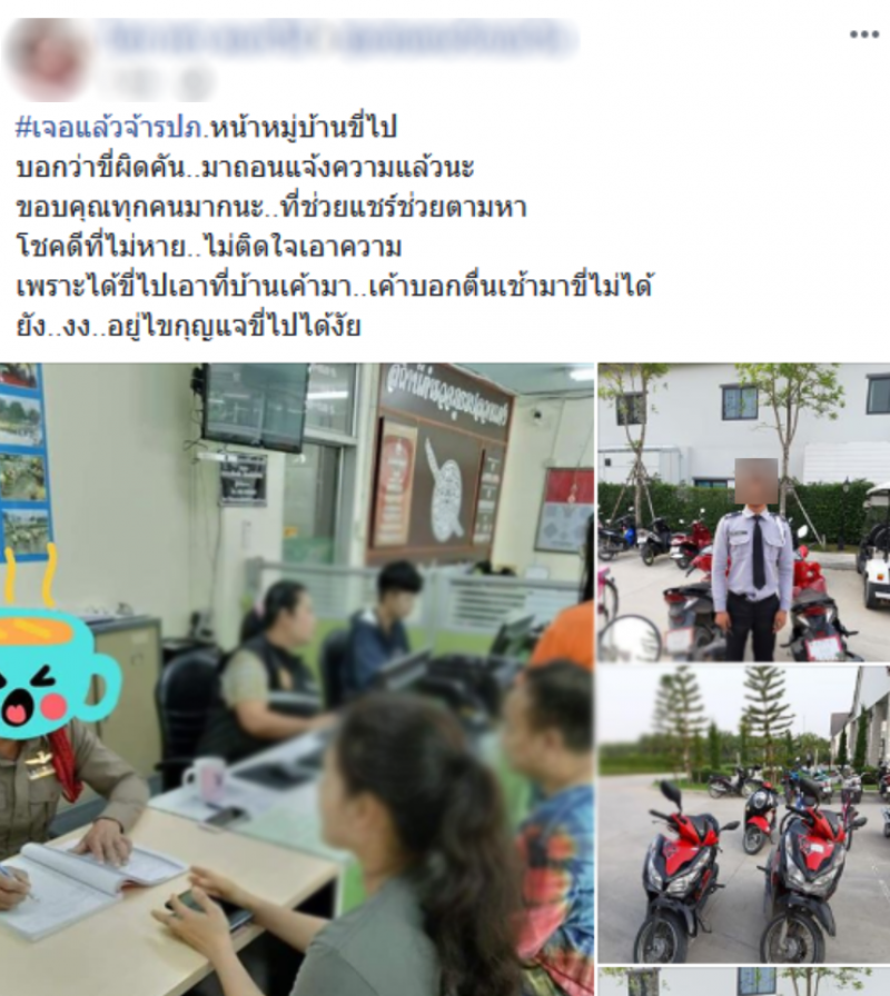 โดยผู้ใช้เฟซบุ๊กรายนี้กล่าวว่าได้ประกาศตามหารถ จยย ของตนที่จู่ ๆ ก็หายไป ซึ่งในตอนแรกก็คิดว่ามีคนมาขโมยรถ จยย.ไป