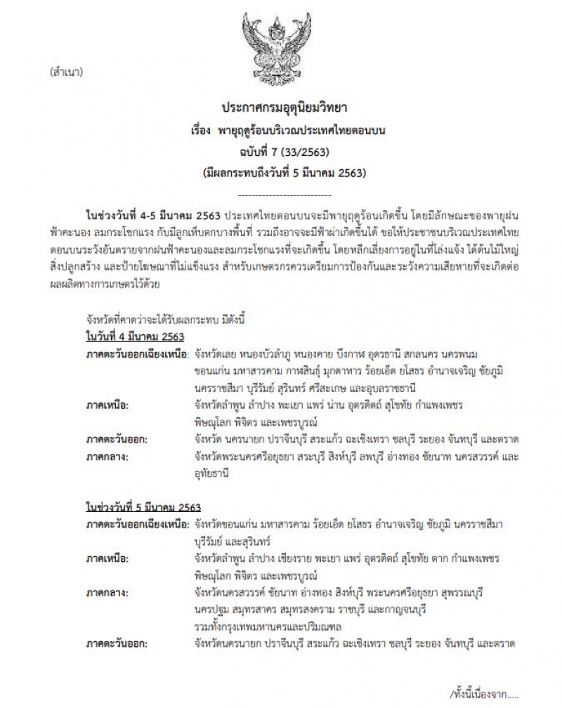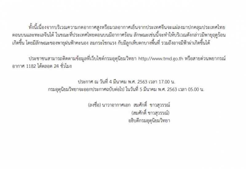 เว็บไซต์กรมอุตุนิยมวิทยาเผยแพร่ประกาศกรมอุตุนิยมวิทยา พายุฤดูร้อนบริเวณประเทศไทยตอนบน มีผลกระทบถึงวันที่ 5 มีนาคม 2563 ฉบับที่ 7 ลงวันที่ 04 มีนาคม 2563