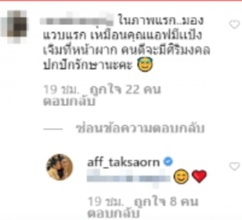โดยชาวโซเชียลรายหนึ่ง ได้เเสดงความคิดเห็นว่า ในภาพแรก มองแวบแรก เหมือนคุณแอฟมีเเป้งเจิมที่หน้าผาก คนดีจะมีศิริมงคลปกปักรักษานะคะ งานนี้สาวแอฟ จึงมาตอบคอมเมนต์ด้วยอิโมจิรูปหัวใจอีกด้วย