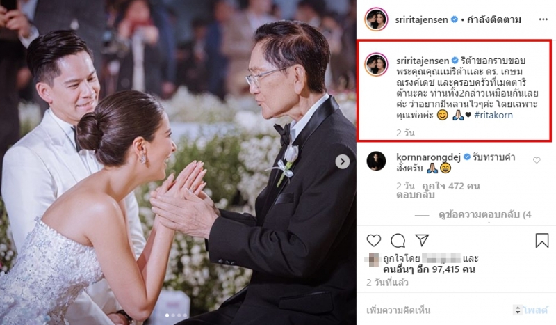 โดยงานนี้ สาวริต้า ได้โพสต์ระบุข้อความว่า ริต้าขอกราบขอบพระคุณคุณเเม่ริต้าเเละ ดร เกษม ณรงค์เดช และครอบครัวที่เมตตาริต้านะคะ ท่านทั้ง 2 กล่าวเหมือนกันเลยค่ะ ว่าอยากมีหลานไวๆค่ะ โดยเฉพาะคุณพ่อค่ะ ritakorn