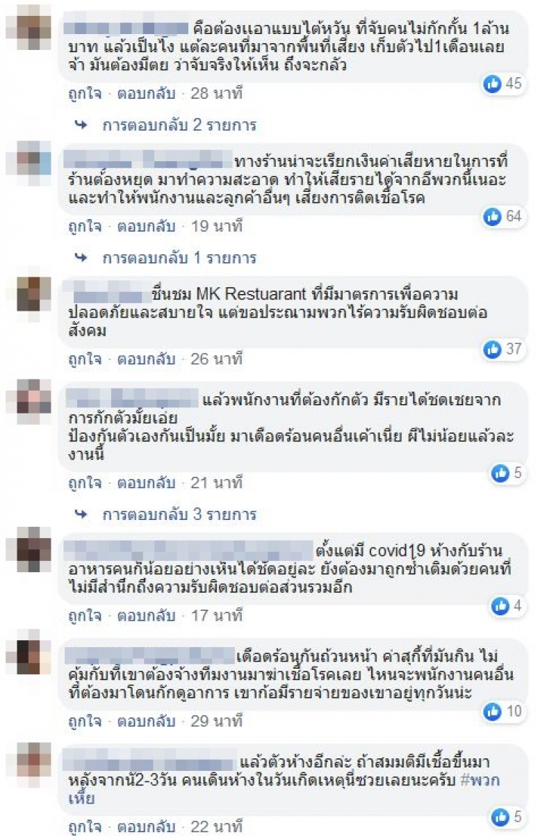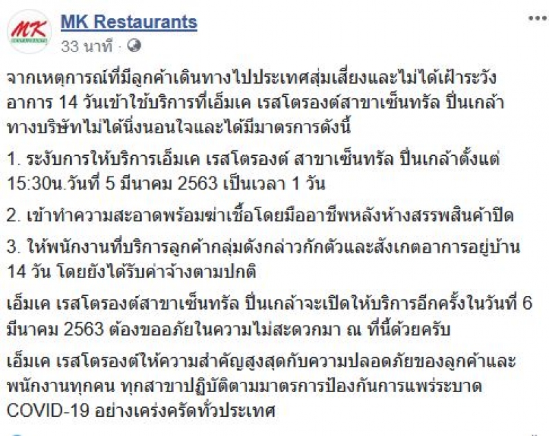 วันที่ 5 มีนาคม 63 MK Restaurants ได้ออกชี้แจงว่า จากเหตุการณ์ที่มีลูกค้าเดินทางไปประเทศสุ่มเสี่ยงและไม่ได้เฝ้าระวังอาการ 14 วันเข้าใช้บริการที่เอ็มเค เรสโตรองต์สาขาเซ็นทรัล ปิ่นเกล้า ทางบริษัทไม่ได้นิ่งนอนใจและได้มีมาตรการดังนี้