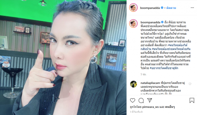 ล่าสุด ทางด้านของนักแสดง พิธีกรคนดัง บุ๋ม ปนัดดา วงศ์ผู้ดี ได้มีการออกเคลื่อนไหวถึงประเด็นนี้ผ่านเฟซบุ๊ก ฝากถึงแรงงานไทยทุกท่าน ข้อความระบุว่า พี่เคยช่วยเหลือคนไทยที่ไปเกาหลี และประเทศอื่น ๆ มาเยอะมาก โดยไม่สนว่าคุณจะไปด้วยวิธีการใด อยู่เกินวีซ่ากำหนดขนาดไหน แต่เมื่อเดือดร้อน อยากกลับบ้าน พี่พยายามหาทางช่วยเหลืออย่างเต็มที่ คิดเพียงว่า คนไทยต้องได้กลับบ้าน คนไทยต้องช่วยคนไทยด้วยกัน