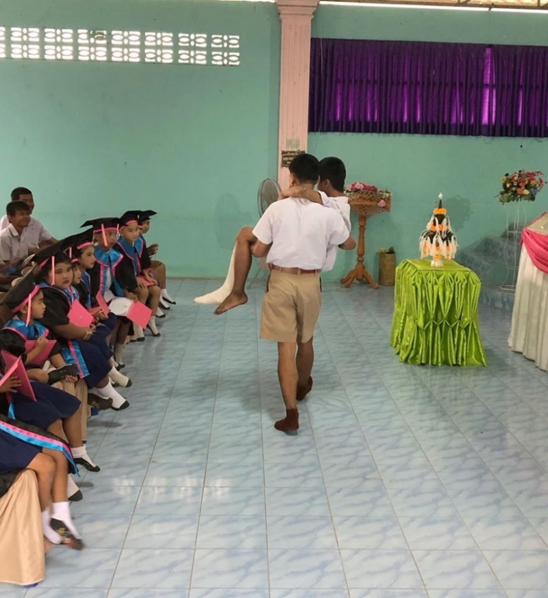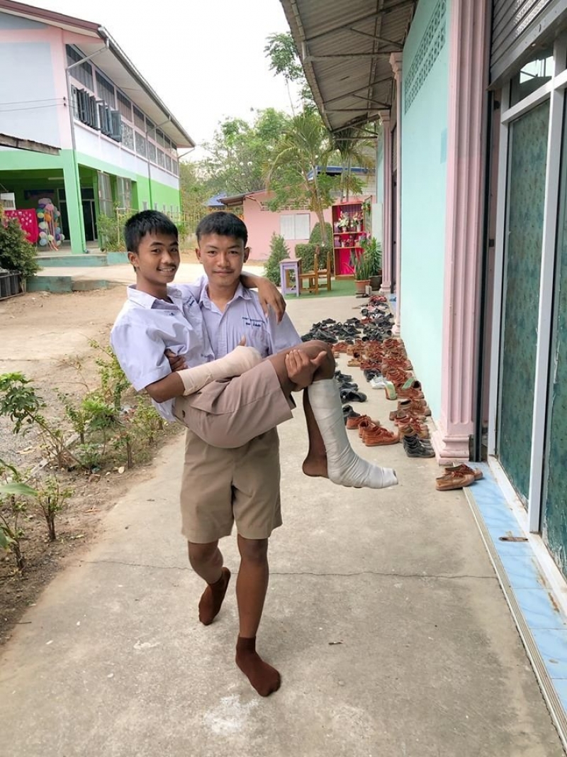 เช่นเดียวกับ นักเรียนชายคนนี้ ที่ไม่ทิ้งเพื่อน แม้เพื่อนจะต้องใส่เฝือกเดินเองไม่ได้ จึงตัดสินใจ ไปอุ้มเพื่อนมาร่วมงานปัจฉิมนิเทศที่โรงเรียน โดยคุณครูได้เก็บภาพน่าประทับใจนี้ไว้ พร้อมระบุข้อความว่า ครูครับรอแป๊บนึงครับ รอกุ้งก่อน 1 ภาพล้านความหมาย คำว่าเพื่อนไม่เคยทิ้งกัน ปัจฉิม สถาบัน คิดถึงเพื่อน