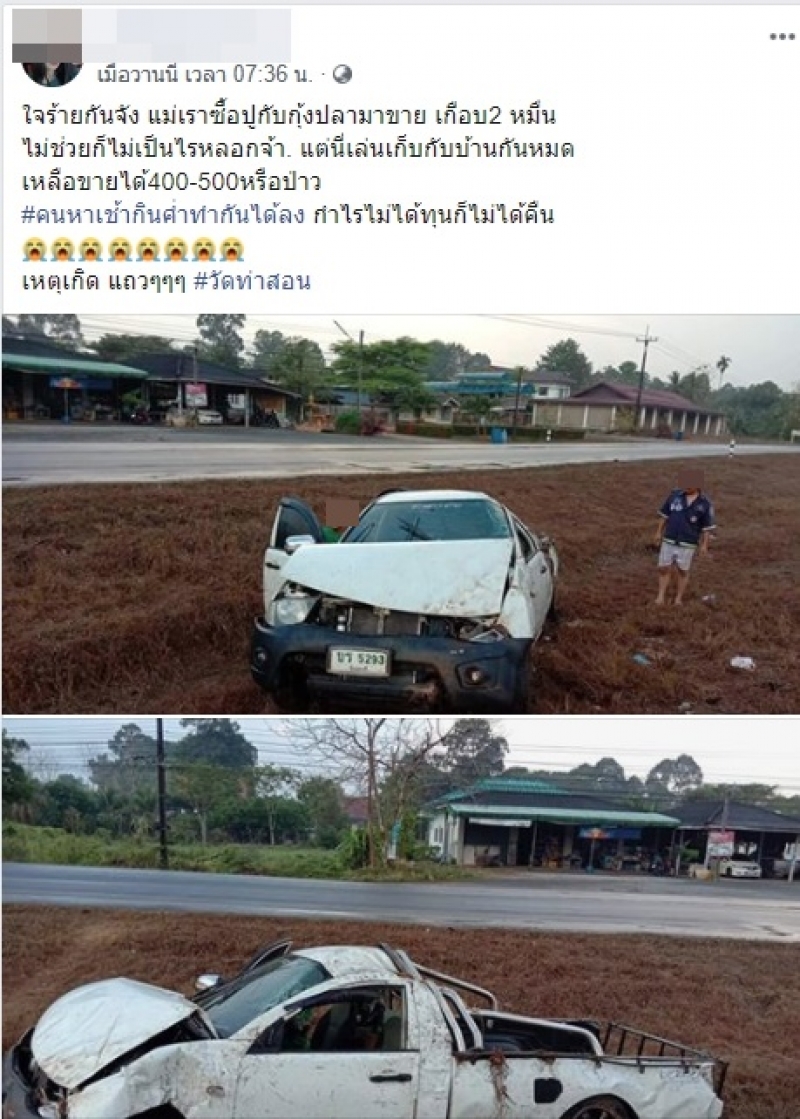 ใจร้ายกันจัง แม่เราซื้อปูกับกุ้งปลามาขาย เกือบ 2 หมื่น ไม่ช่วยก็ไม่เป็นไรหลอกจ้า แต่นี่เล่นเก็บกับบ้านกันหมด เหลือขายได้ 400-500หรือป่าว คนหาเช้ากินค่ำทำกันได้ลง กำไรไม่ได้ทุนก็ไม่ได้คืน เหตุเกิด แถวๆวัดท่าสอน