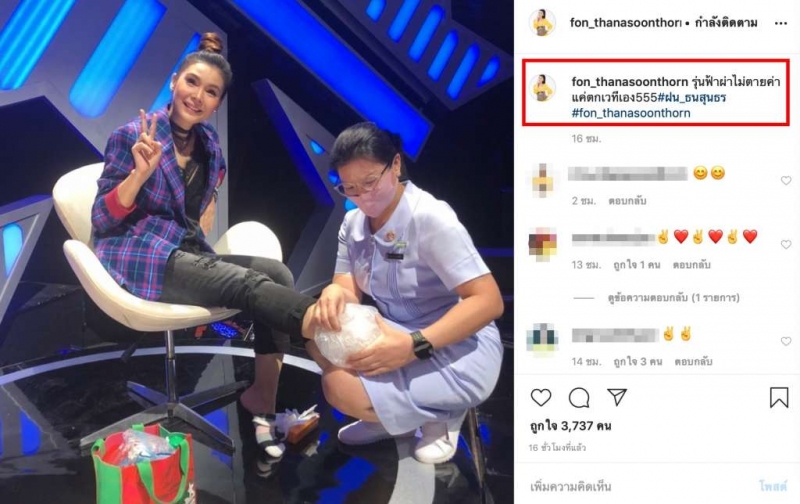 ทั้งนี้ล่าสุดทำเอาแฟนคลับตกอกตกใจไม่น้อย เมื่อ “ฝน ธนสุนธร” ได้โพสต์ภาพที่นางพยาบาลกำลังประคบน้ำแข็งที่เท้าพร้อมชูมือสองนิ้วกับแคปชั่นว่า