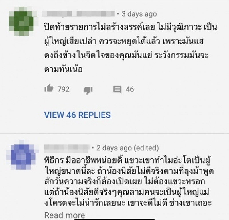 ปิดท้ายรายการไม่สร้างสรรค์เลย ไม่มีวุฒิภาวะ เป็นผู้ใหญ่เสียเปล่า ควรจะหยุดได้แล้ว เพราะมันแสดงถึงข้างในของคุณมันแย่