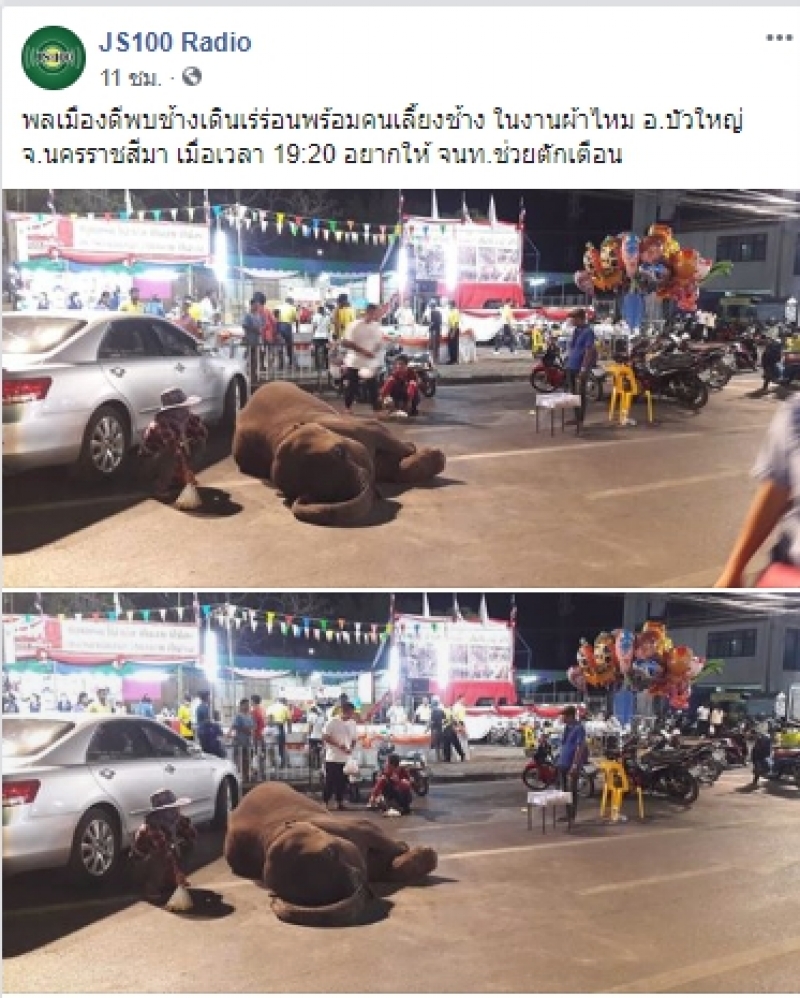 เมื่อวันที่ 7 มีนาคม 2563 ทางเพจ JS100 Radio ได้มีการโพสต์รูปภาพช้างที่นอนหมดแรงอยู่ข้างถนน หลังจากถูกบังคับให้ออกมาเดินหากิน โดยทางเพจได้ระบุข้อความเอาไว้ว่า