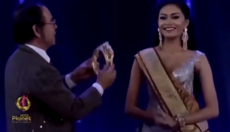 เรียกได้ว่าเป็นคลิปสุดฮาที่โลกออนไลน์เข้ามาแชร์กันเป็นจำนวนมาก จากกรณีผู้ใช้เฟซบุ๊กรายหนึ่งโพสต์คลิปนาทีการประกวด Miss Planet International ที่เพิ่งประกาศรางวัลชนะเลิศอันดับ 1 บนเวที จากนั้นได้มีกรรมการขึ้นไปบนเวทีเพื่อที่จะสวมมงกุฎให้กับผู้ครองตำแหน่ง