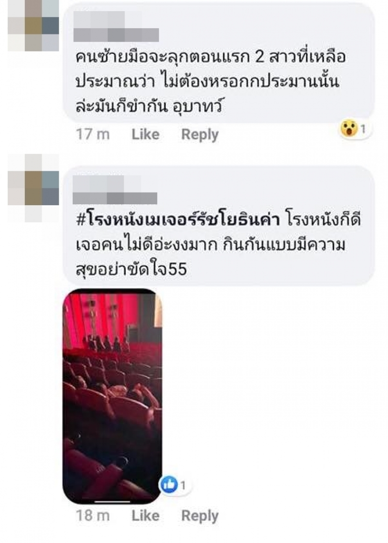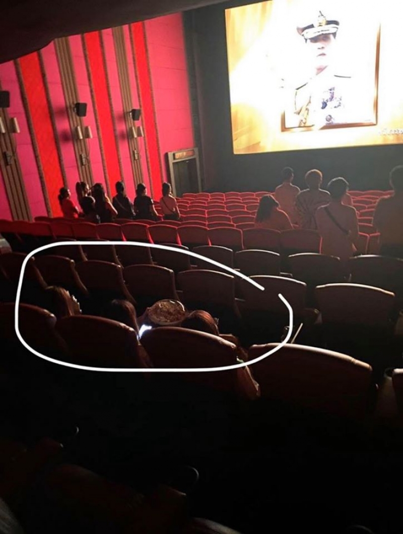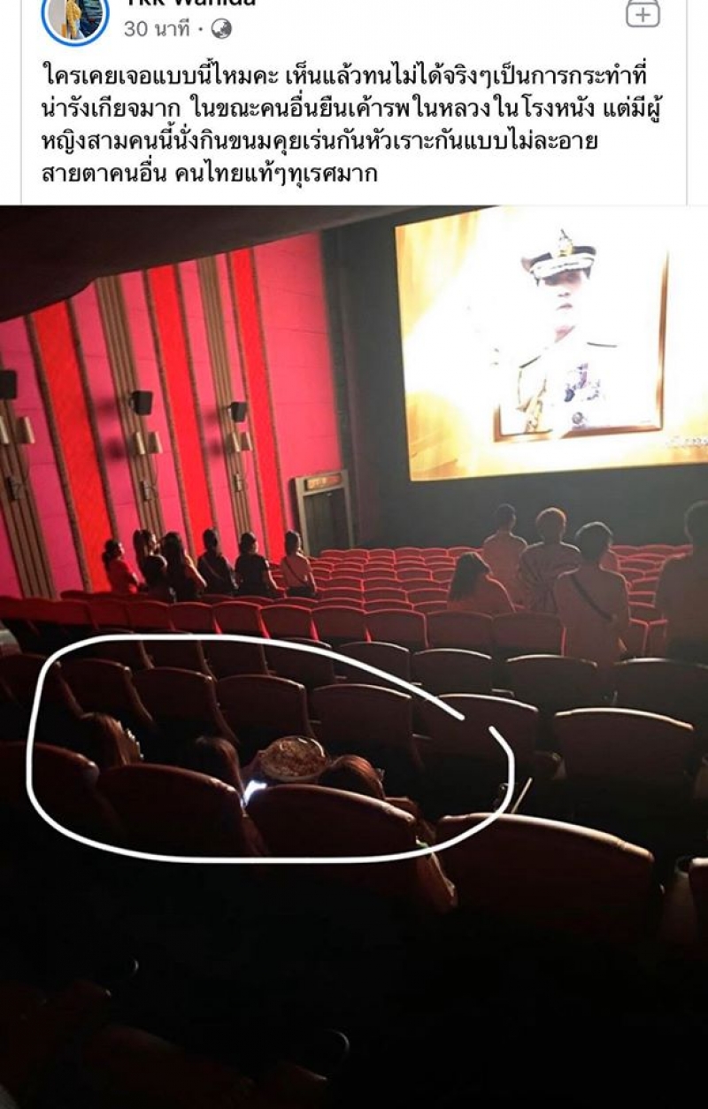 ผู้ใช้เฟซบุ๊กโพสต์ข้อความระบุว่า ใครเคยเจอแบบนี้ไหมคะ เห็นแล้วทนไม่ได้จริงๆเป็นการกระทำที่แย่มาก ในขณะที่คนอื่นยืนเคารพในหลวงในโรงหนัง แต่มีผู้หญิงสามคนนี้นั่งกินขนมคุยเล่นกันหัวเราะกันแบบไม่อายสายตาคนอื่น คนไทยแท้ๆ