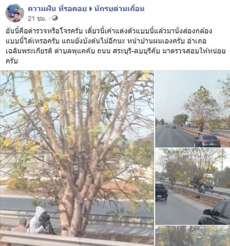 อันนี้คือตำรวจหรืออะไรครับ เดี๋ยวนี้เค้าแต่งตัวแบบนี้แล้วมานั่งส่องกล้องแบบนี้ได้เหรอครับ แถมยังบังต้นไม้อีกนะ หน้าบ้านผมเองครับ อำเภอเฉลิมพระเกียรติ ตำบลพุแค ครับ ถนน สระบุรี-ลพบุรีครับ มาตรวจสอบให้หน่อยครับ