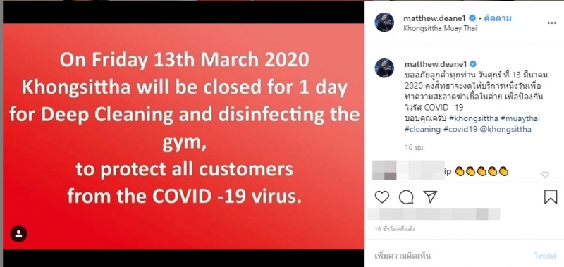 โดยก่อนหน้านี้ แมทธิว ดีน เคยได้โพสต์ข้อความก่อนหน้านี้ว่า ขออภัยลูกค้าทุกท่าน วันศุกร์ ที่ 13 มีนาคม 2020 คงสิทธาจะงดให้บริการหนึ่งวันเพื่อทำความสะอาดเพื่อป้องกัน COVID -19