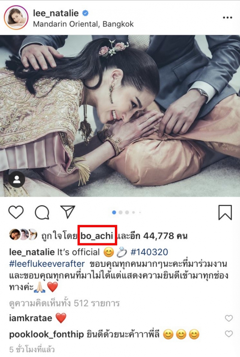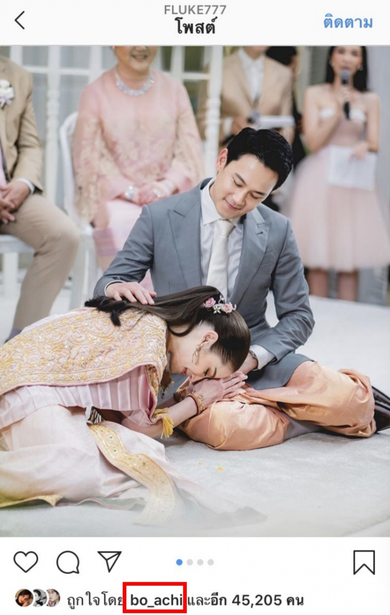 อีกทั้งทางด้าน สาวโบ ยังได้เข้าไปกดไลค์ที่รูปพิธีวิวาห์ในอินสตาแกรมของ หนุ่มฟลุค และไม่เพียงเท่านั้น สาวโบ เอง ยังได้เข้าไปกดไลค์รูปในพิธีวิวาห์ที่ สาวนาตาลี ขณะก้มกราบ หนุ่มฟลุค ด้วยเช่นกัน และเป็นที่ทราบกันดีว่าทั้ง2ฝ่าย นั้นได้มีความสัมพันธ์ที่ดีต่อกันแม้จะเลิกกันไปนานแล้วก็ตาม