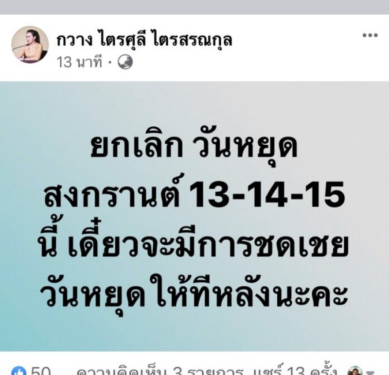 ขณะที่ นส ไตรศุลี ไตรสรณกุล รองโฆษกประจำสำนักนายกรัฐมนตรี โพสต์ข้อความระบุว่า จะมีการชดเชยวันหยุดสงกรานต์ให้ภายหลัง ข้อความระบุว่า ยกเลิกวันหยุดสงกรานต์ 13-14-15 นี้ เดี๋ยวจะมีการชดเชยวันหยุดให้ทีหลังนะคะ