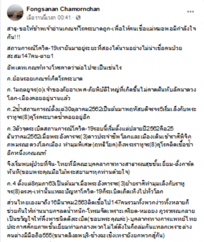 เมื่อวันที่ 17 มีนาคม 2563 ที่เฟซบุ๊ก Fongsanan Chamornchan ได้ระบุข้อความว่า…สาธุ-ขอให้ข้าพเจ้าอ่านเกณฑ์โรคระบาดถูก-เพื่อให้คนเชื่อแม่หมอพอมีกำลังใจกันสถานการณ์โควิด-19เรายันมาอยู่ระยะที่สองได้นานอย่างไม่น่าเชื่อคนป่วยสะสม 147 คน อัพเดทเกณฑ์ทางโหรคาดว่าต่อไปจะเป็นเช่นไร