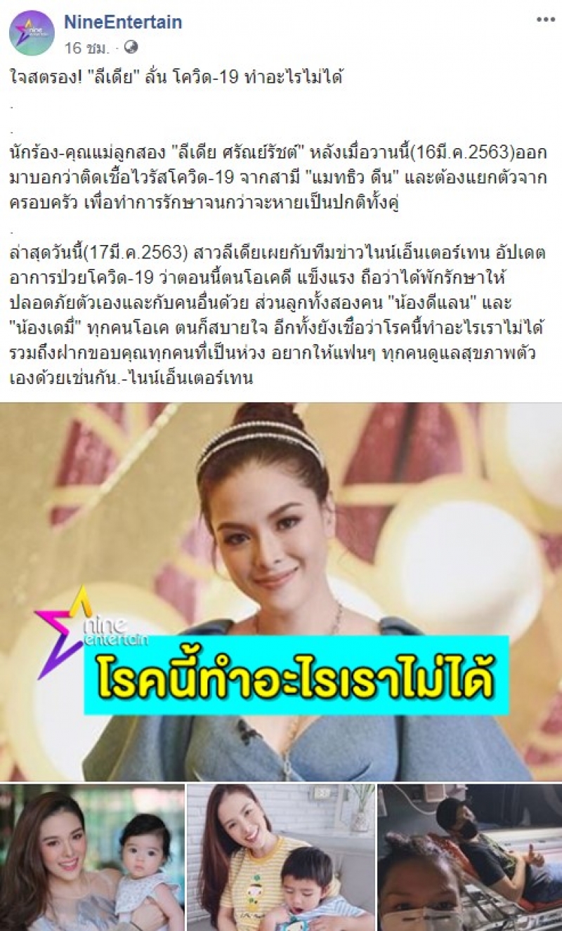 ยังคงเข้ารับการรักษาตัวอยู่ที่โรงบาลอยู่เลยค่ะ สำหรับพิธีกรและนักแสดงหนุ่มแมทธิว ดีน กับ สาวลิเดีย ศรัณย์รัชต์ โดยเมื่อวันที่ 13 มีนาคม 2563 ที่ผ่านมาทางหนุ่มแมทธิวได้ออกมาเปิดเผยว่าตนเองติด CD-19 และสาวลิเดีย ก็ออกมาประกาศว่าต้นก็ติดกับสามีเช่นเดียวกัน