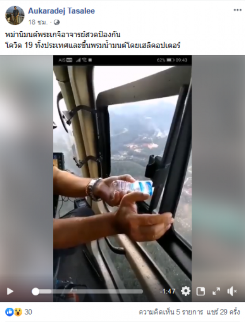 เรียกได้ว่าเป็นอีกหนึ่งเรื่องราวที่โซเชียลเข้ามาแสดงความเห็นกันเป้นจำนวนมาก หลังมีผู้ใช้เฟสบุ๊คชื่อ Aukaradej Tasalee ได้โพสต์คลิปที่มีพระสงฆ์กำลังสวดมนต์อยู่บนเฮลิคอปเตอร์ พร้อมกันนั้น มีขันและน้ำคอยตักจากขันที่พระได้สวดมนต์แล้วตักส่งให้นักบินโปรยลงไปด้านล่าง โดยผู้โพสต์ระบุว่า