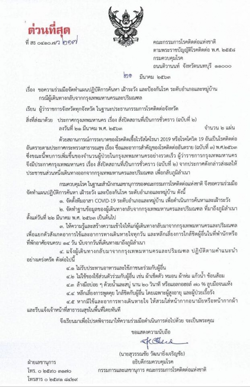 ล่าสุด จากประกาศดังกล่าว ส่งผลให้ประชาชนจำนวนหนึ่ง เดินทางออกจากกรุงเทพมหานคร และปริมณฑล เพื่อกลับภูมิลำเนา กรมควบคุมโรคจึงได้มีหนังสือด่วน ถึงผู้ว่าทุกจังหวัด ขอความร่วมมือทำแผนปฏิบัติ เฝ้าระวัง กรณีมีคนเดินทางกลับจาก กทม ปริมณฑล ตามประกาศดังนี้