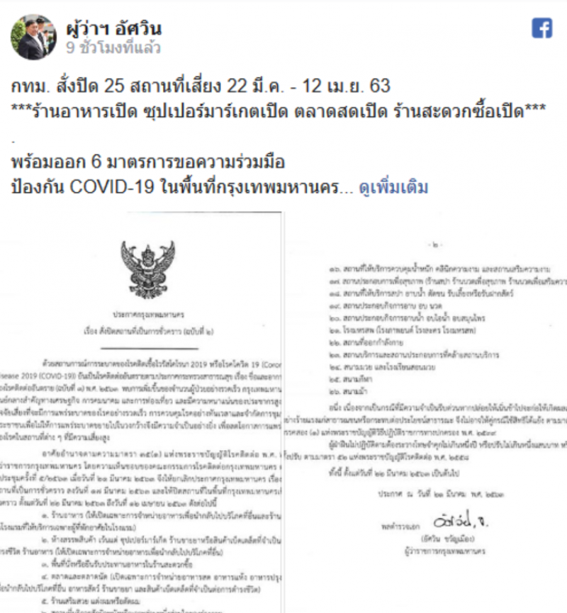 วันที่ 22 มีนาคม ด้วยสถานการณ์การระบาดของโรคติดเชื้อไวรัสโคโรนา 2019 หรือโรคโควิด 19 Coronavirus Disease 2019 COVID-19 อันเป็นโรคติดต่ออันตรายตามประกาศกระทรวงสาธารณสุข เรื่อง ชื่อและอาการสําคัญ ของโรคติดต่ออันตราย ฉบับที่ 3 พ.ศ. 2523 พบการเพิ่มขึ้นของจํานวนผู้ป่วยอย่างรวดเร็ว กรุงเทพมหานครเป็น ศูนย์กลางสําคัญทางเศรษฐกิจ การคมนาคม และการท่องเที่ยว และมีความหนาแน่นของประชากรสูงถือเป็น ปัจจัยเสี่ยงที่จะมีการแพร่ระบาดของโรคอย่างรวดเร็ว ผู้ว่าฯกรุงเทพฯ จึงประกาศ เรื่อง สั่งปิดสถานที่เป็นการชั่วคราว ฉบับที่ 2