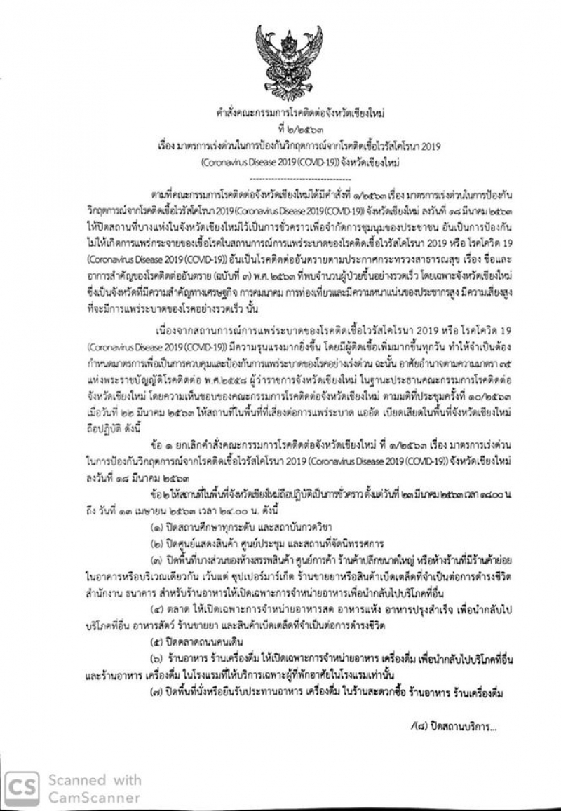 คณะกรรมการโรคติดต่อจังหวัดเชียงใหม่จำเป็นต้องเพิ่มมาตรการเพื่อปิดกันวงจรการแพร่ระบาดสู่สถานที่ใดสถานที่หนึ่งเกินความจำเป็นมากเกินไป จึงมีความจำเป็นปรับปรุงประกาศจังหวัดเชียงใหม่ในการปิดสถานที่บางแห่งเดิมและปรับปรุงใหม่เป็นประกาศฉบับที่ 2