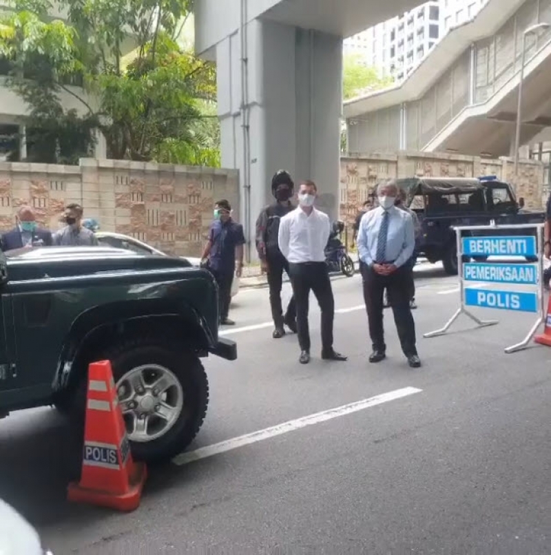 สมเด็จพระราชาธิบดี สุลต่านอับดุลลาห์ ทรงฉลองพระองค์เรียบง่าย และทรงสวมหน้ากากอนามัย ประทับอยู่บนถนนร่วมกับเจ้าหน้าที่ ในขณะที่พระราชโอรสฉลองพระองค์เสื้อเชิ้ตสีขาว ทรงยืนอยู่ใกล้ ๆ และ โดยพระองค์ทรงงานอยู่ที่ด่านตรวจคัดกรองเป็นเวลา 30 นาที เพื่อทอดพระเนตรการปฏิบัติงานของเจ้าหน้าที่