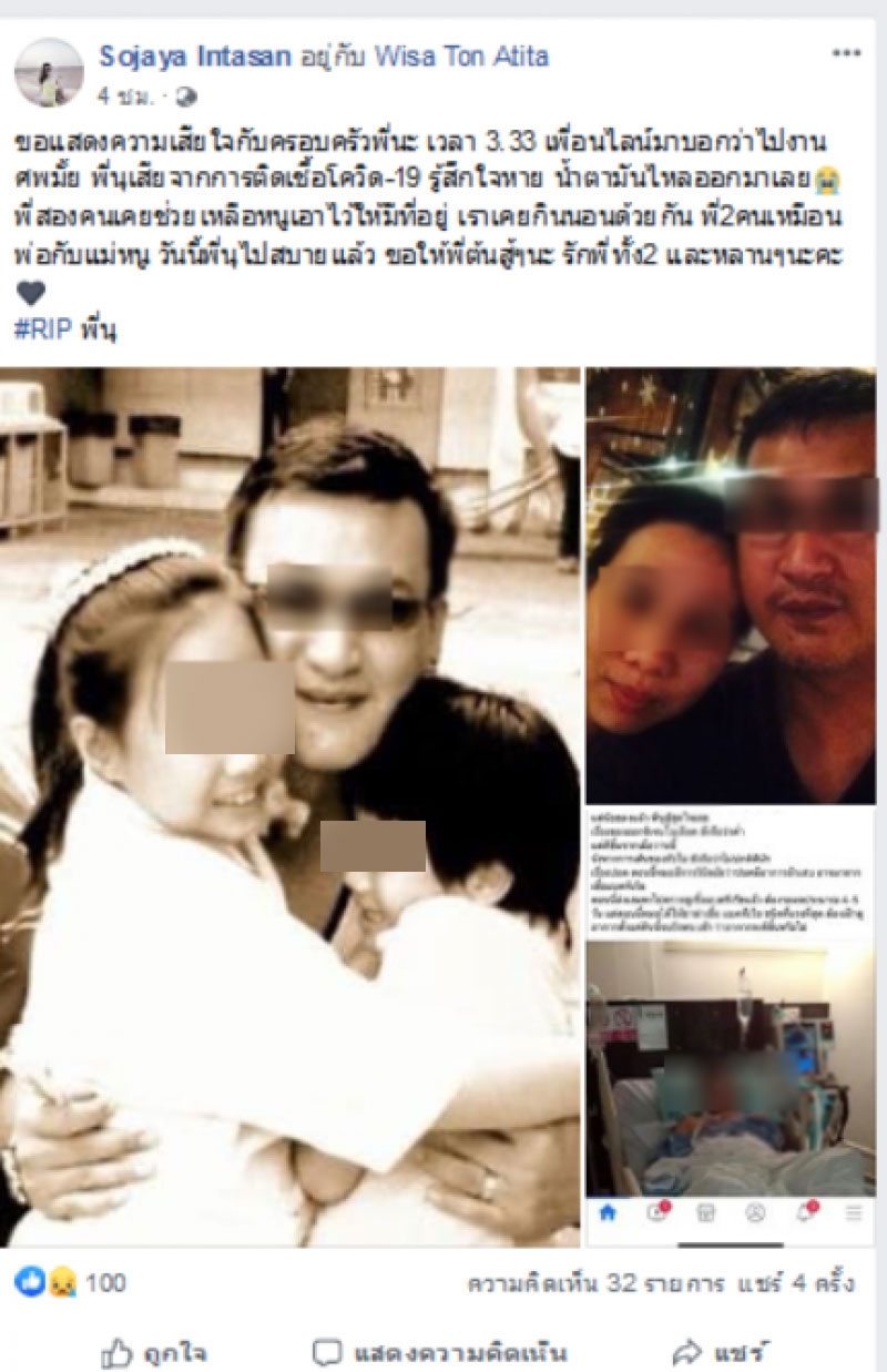 เรียกว่าถือเป็นข่าวเศร้าอีกครั้งหนึ่ง สำหรับการระบาดของcovid-19 หลฃังมีผู้ใช้เฟสบุ๊คชื่อ Sojaya Intasan ได้ออกมาโพตส์ภาพ่านเฟสบุ๊คส่วนตัว โดยำด้ระบุจข้อความว่า ขอแสดงความเสียใจกับครอบครัวพี่นะ เวลา 3.33 เพื่อนไลน์มาบอกว่าไปงานมั้ย พี่นุเสียจากการติดเชื้อโควิด-19 รู้สึกใจหาย น้ำตามันไหลออกมาเลยพี่สองคนเคยช่วยเหลือหนูเอาไว้ให้มีที่อยู่ เราเคยกินนอนด้วยกัน พี่2คนเหมือนพ่อกับแม่หนู วันนี้พี่นุไปสบายแล้ว ขอให้พี่ต้นสู้ๆนะ รักพี่ทั้ง2 และหลานๆนะคะ