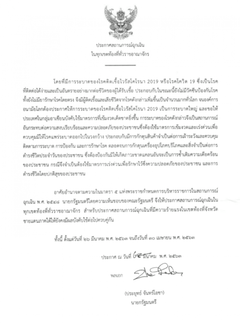 สำหรับรายละเอียด พรก การบริหารราชการในสถานการณ์ฉุกเฉิน พ ศ 2548 หรือ พรก ฉุกเฉิน คุมโควิด 19 บังคับใช้ตั้งแต่ วันที่ 26 มีนาคม ถึง 30 เมษายน 2563