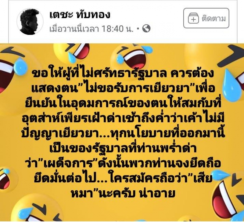 ขอให้ผู้ที่ไม่ศรัทธารัฐบาล ควรต้องแสดงตน ไม่ขอรับการเยียวยา”เพื่อยืนยันในอุดมการณ์ของตนให้สมกับที่อุตส่าห์เพียรเฝ้าด่าเช้าถึงค่ำว่าเค้าไม่มีปัญญาเยียวยา ทุกนโยบายที่ออกมานี้เป็นของรัฐบาลที่ท่านพร่ำด่าว่า”เผด็จการ ดังนั้นพวกท่านจงยึดถือยึดมั่นต่อไป ใครสมัครถือว่า เสียหมา นะครับ น่าอาย