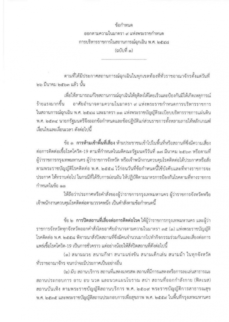 ข้อกำหนด ออกตามความในมาตรา ๙ แห่งพระราชกำหนด การบริหารราชการในสถานการณ์ฉุกเฉิน พศ 2548 ฉบับที่ 1ตามที่ได้มีประกาศสถานการณ์ฉุกเฉินในทุกเขตท้องที่ทั่วราชอาณาจักรตั้งแต่วันที่26 มีนาคม 2563 แล้ว นั้นเพื่อให้สามารถแก้ไขสถานการณ์ฉุกเฉินให้ยุติลงได้โดยเร็วและป้องกันมิให้เกิดเหตุการณ์ร้ายแรงมากขึ้น อาศัยอำนาจตามความในมาตรา 9 แห่งพระราชกำหนดการบริหารราชการในสถานการณ์ฉุกเฉิน พศ 2548 และมาตรา 11 แห่งพระราชบัญญัติระเบียบบริหารราชการแผ่นดิน พศ 2534 นายกรัฐมนตรีจึงออกข้อกำหนดและข้อปฏิบัติแก่ส่วนราชการทั้งหลายภายใต้หลักเกณฑ์เงื่อนไขและเงื่อนเวลา ดังต่อไปนี้