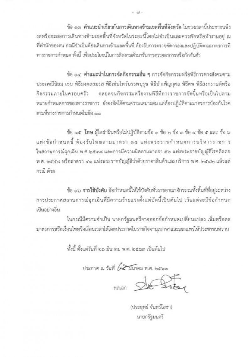 ข้อ 13 คำแนะนำเกี่ยวกับการเดินทางข้ามเขตพื้นที่จังหวัด ในช่วงเวลานี้ประชาชนพึงงดหรือชะลอการเดินทางข้ามเขตพื้นที่จังหวัดในระยะนี้โดยไม่จำเป็นและควรพักหรือทำงานอยู่ ณ ที่พำนักของตน กรณีจำเป็นต้องเดินทางข้ามเขตพื้นที่ ต้องรับการตรวจคัดกรองและปฏิบัติตามมาตรการที่ทางราชการกำหนด ทั้งนี้ เพื่อประโยชน์ในการติดตามตัวมารับการตรวจอาการหรือกักกันตัว