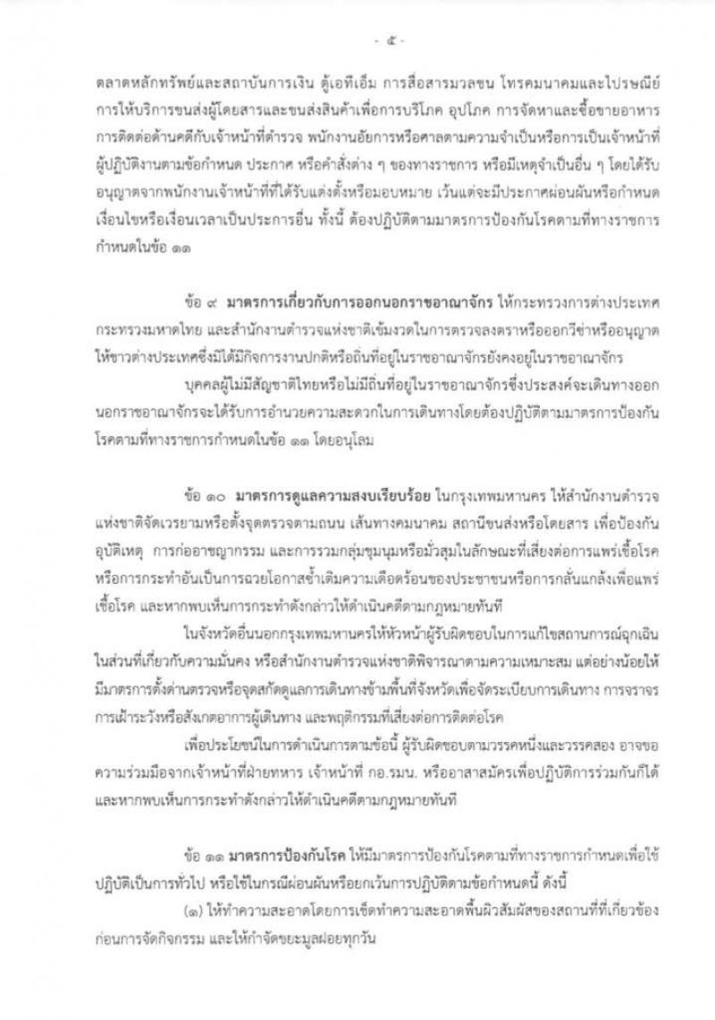 ทั้งนี้ เว้นแต่บุคคลดังกล่าวมีความจำเป็นเพื่อการพบแพทย์ การรักษาพยาบาลการปฏิบัติหน้าที่แพทย์พยาบาลหรือบุคลากรทางการแพทย์ การปฏิบัติงานหรือการทำธุรกรรมเกี่ยวกับตลาดหลักทรัพย์และสถาบันการเงิน ตู้เอทีเอ็ม การสื่อสารมวลชน โทรคมนาคมและไปรษณีย์ การให้บริการขนส่งผู้โดยสารและขนส่งสินค้าเพื่อการบริโภค อุปโภค การจัดหาและซื้อขายอาหารการติดต่อด้านคดีกับเจ้าหน้าที่ตำรวจ พนักงานอัยการหรือศาลตามความจำเป็นหรือการเป็นเจ้าหน้าที่ผู้ปฏิบัติงานตามข้อกำหนด ประกาศ หรือคำสั่งต่าง ๆ ของทางราชการ หรือมีเหตุจำเป็นอื่น ๆ โดยได้รับอนุญาตจากพนักงานเจ้าหน้าที่ที่ได้รับแต่งตั้งหรือมอบหมาย เว้นแต่จะมีประกาศผ่อนผันหรือกำหนดเงื่อนไขหรือเงื่อนเวลาเป็นประการอื่น ทั้งนี้ ต้องปฏิบัติตามมาตรการป้องกันโรคตามที่ทางราชการกำหนดในข้อ 11