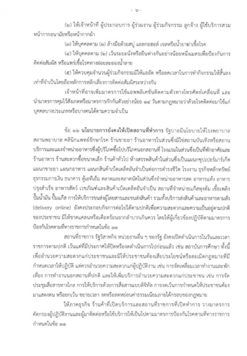 ข้อ 12 นโยบายการยังคงให้เปิดสถานที่ทำการ รัฐบาลมีนโยบายให้โรงพยาบาล สถานพยาบาล คลินิกแพทย์รักษาโรค ร้านขายยา ร้านอาหารในส่วนซึ่งมิใช่สถานบันเทิงหรือสถานบริการและแผงจำหน่ายอาหารซึ่งผู้บริโภคซื้อไปบริโภคนอกสถานที่ โรงแรมในส่วนซึ่งเป็นที่พักอาศัยและร้านอาหาร ร้านสะดวกซื้อขนาดเล็ก ร้านค้าทั่วไป ห้างสรรพสินค้าในส่วนซึ่งเป็นแผนกซุปเปอร์มาร์เก็ต แผนกขายยา แผนกอาหาร แผนกสินค้าเบ็ดเตล็ดอันจำเป็นต่อการดำรงชีวิต โรงงาน ธุรกิจหลักทรัพย์ ธุรกรรมการเงิน ธนาคาร ตู้เอทีเอ็ม ตลาดและตลาดนัดในส่วนซึ่งจำหน่ายอาหารสด อาหารแห้ง อาหารปรุงสำเร็จ อาหารสัตว์ เวชภัณฑ์และสินค้าเบ็ดเตล็ดอันจำเป็น สถานที่จำหน่ายแก๊สหุงต้ม เชื้อเพลิง ปั๊มน้ำมัน ปั๊มแก็ส การให้บริการขนส่งผู้โดยสารและขนส่งสินค้า รวมทั้งบริการส่งสินค้าและอาหารตามสั่ง delivery online ยังคงประกอบกิจการต่อไปได้ตามปกติเพื่อความสะดวกและความเป็นอยู่ตามปกติของประชาชน มิให้ขาดแคลนหรือเดือดร้อนยากลำบากเกินควร โดยให้ผู้เกี่ยวข้องปฏิบัติตามมาตรการป้องกันโรคตามที่ทางราชการกำหนดในข้อ 11